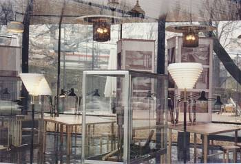 Ein wesentlicher Bestandteil dieser Präsentation waren die Designerstücke des Archiktekten Alvar Aaltos. Diese Modelle konnten in den Ausstellungsräumen originell gruppiert und so tatsächlich "zur Schau gestellt" werden. Hier auf dem Foto sind die originalen Deckenleuchten aus dem Alvar Aalto Kulturhaus Wolfsburg mit den Gebrauchsspuren zu sehen. Die Lampen wurden nur für die Ausstellung demontiert und zur Verfügung gestellt. Im Kontrast dazu erkennt man die neuen Stahlleuchten, die heute noch produziert werden. Diese wurden