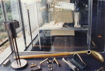 Dieser Berlinausstellung, die in Zusammenarbeit mit der Stadt Wolfsburg, dem Alvar-Aalto-Zentrum Deutschland e.V. Wolfsburg und dem Finnland-Institut Berlin entstand, zeigte neben den Zeichnungen und Modellen vor allem Originalstücke und sogar Bauteile aus den in Wolfsburg befindlichen Aalto-Gebäuden. Hier links ist ein Aschenbecher aus Bronze zu sehen, daneben ein Handlaufkrümmling aus dem Foyer von der Nebentreppe des Alvar-Aalto-Kulturhauses. Aalto hat hier wieder - ganz typisch für ihn - diesen Materialwechsel zwischen Holz und Metall vollzogen, um die Krümmung optimal ausbilden zu können. Die Türbeschläge wurden in Helsinki hergestellt. Aalto brachte sie dann nach Wolfsburg mit. Sie befinden