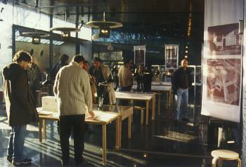 travelling exhibition tried to convey the character of a workshop. Drawing tables and spring-balanced lamps were